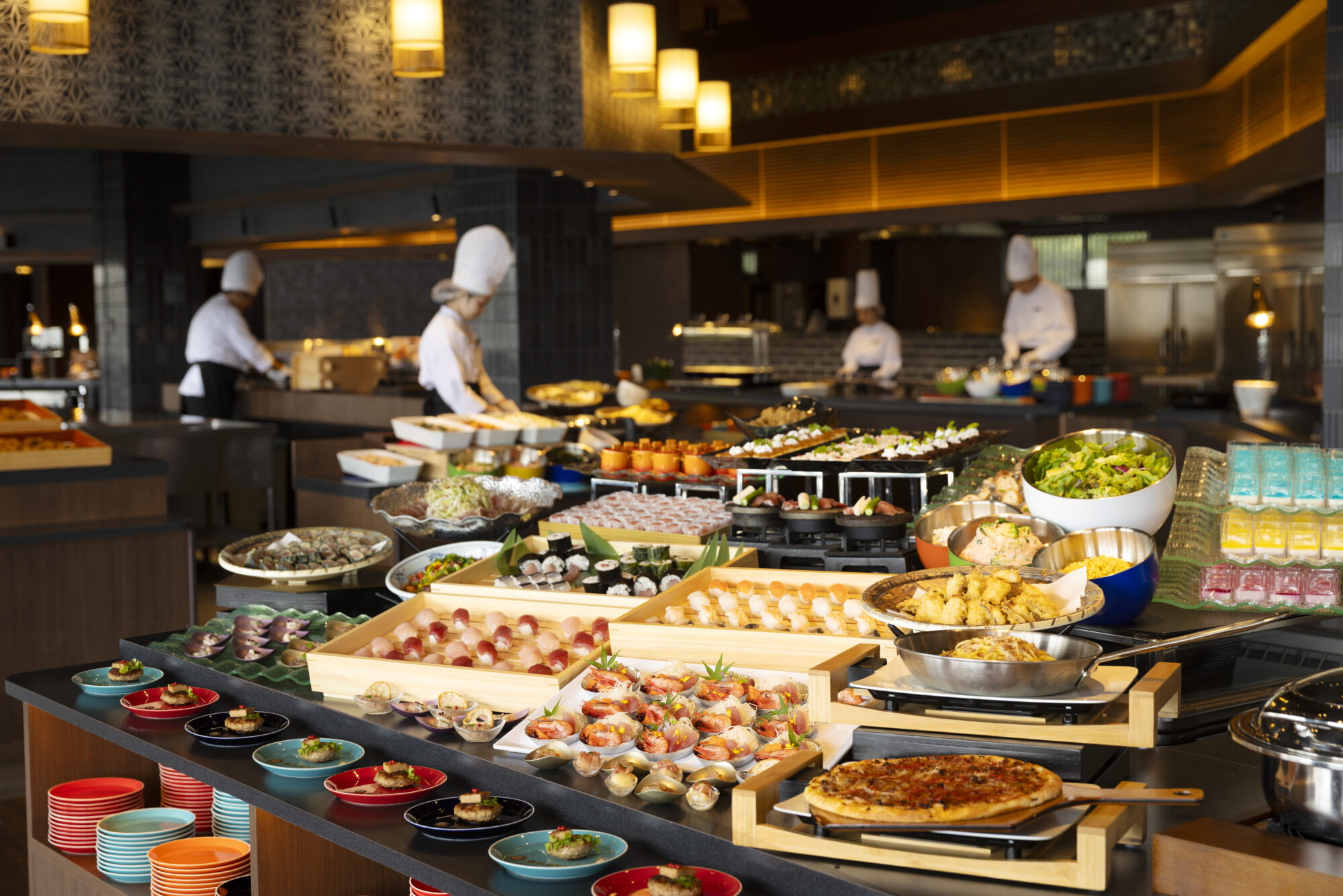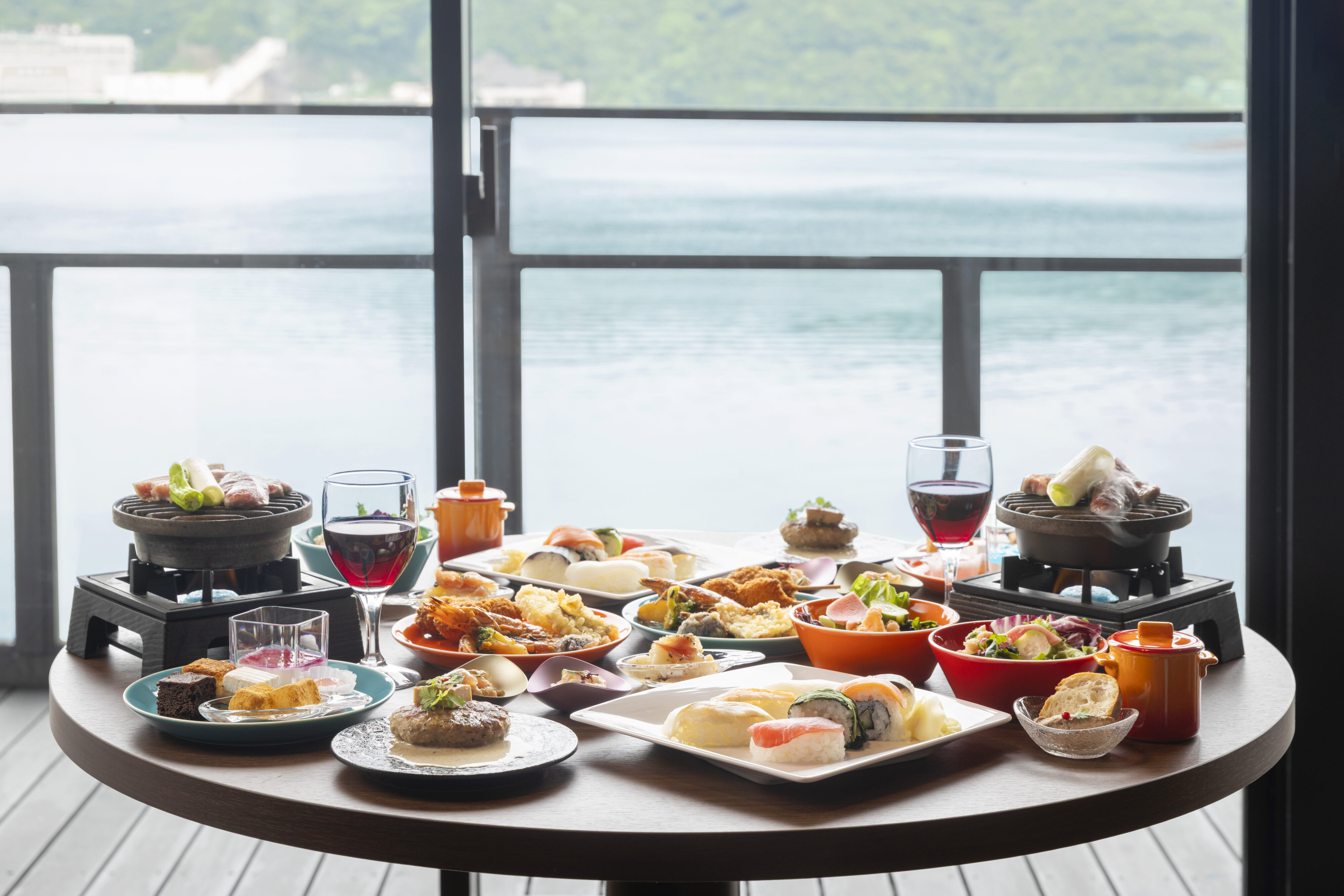 オーシャンビューのレストランでは、まぐろ料理をはじめとする海の幸を味わうメニューをご用意しています。 また、躍動感あふれるライブキッチンを眺めながら、活気のある空間で食事をお楽しみいただけます。夕食時はアルコール飲み放題です。ビールや地酒とともにTAOYAならではの食事をぜひご満喫ください。