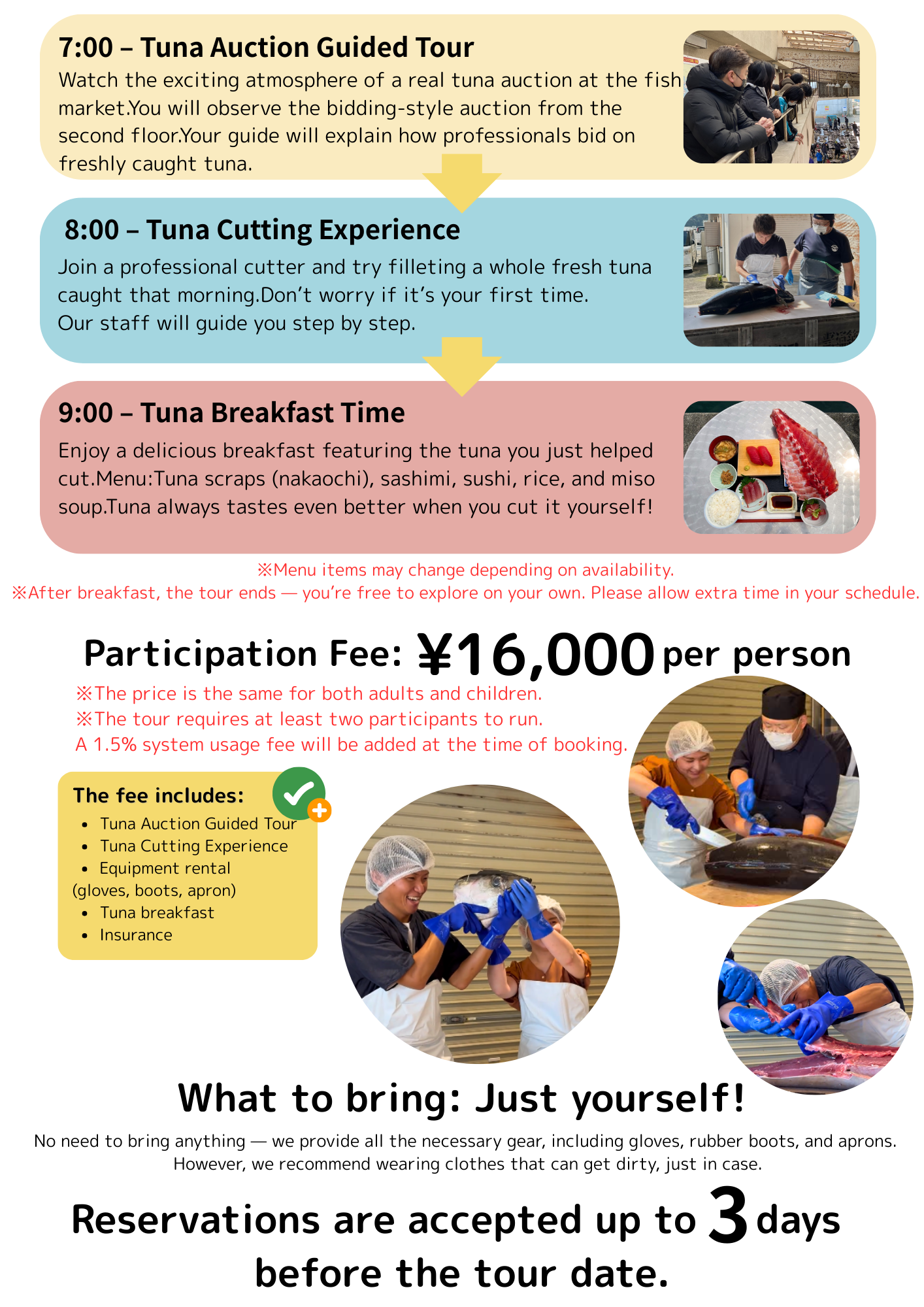 To wrap it all up, you’ll enjoy a delicious breakfast using the tuna you helped cut.